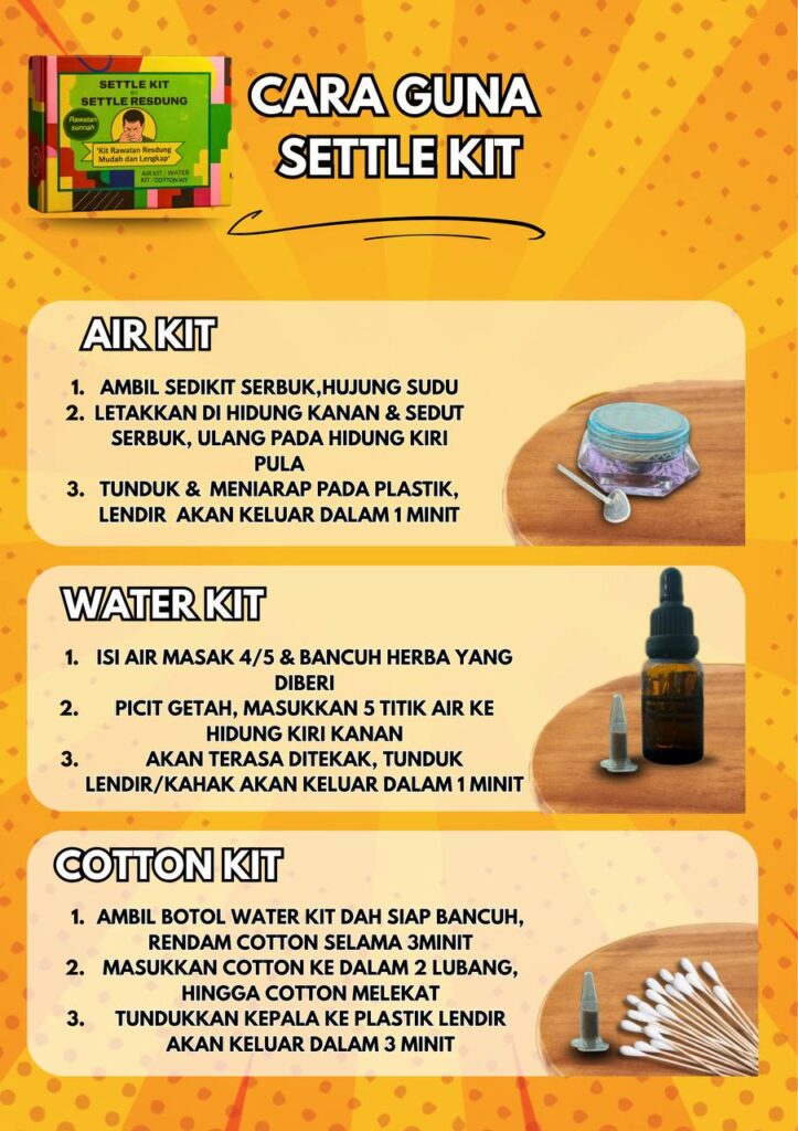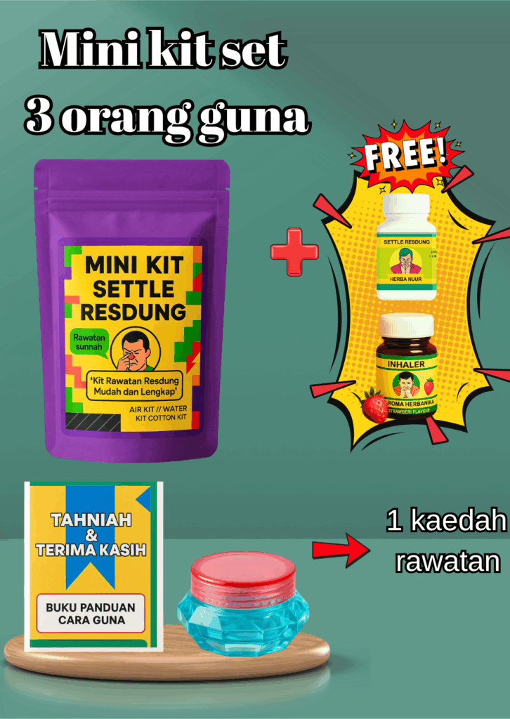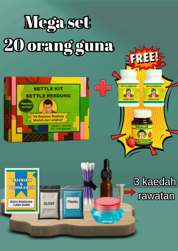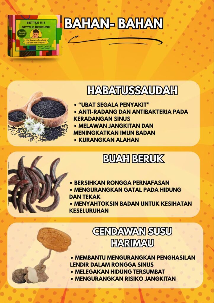 Dengan herba terpilih khas untuk resdung> Ada yang sukar di temui >Perlu pengalaman bertahun-tahun merawat orang untuk jaminan resdung tak datang lagi itu nyata, Setiap kit dibuat dengan teliti agar selamat & mudah digunakan!